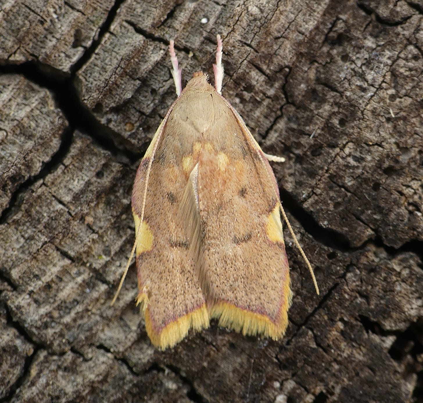 This moth has something of a claim to fame, because it is the only UK representative of the family it is placed in, the Peleopodinae. There are about 200 species in this family worldwide, mostly found in tropical and sub-tropical Asia. One of the features that separates these moths from other families is the length of the antennae, although there are one or two other families which have species with even longer antennae, sometimes two or three times the length of the wings.