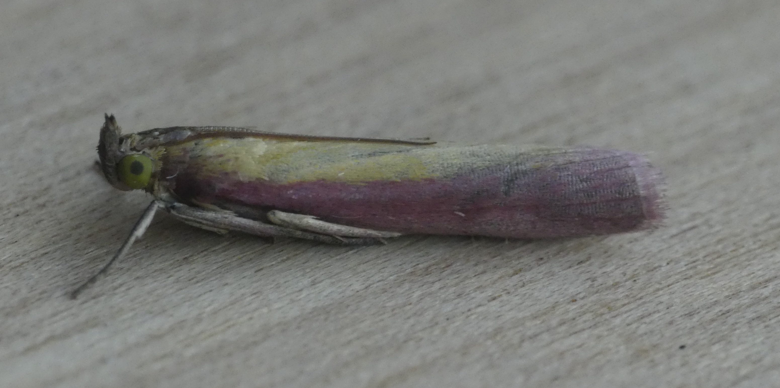 This is one of our larger ‘micro’ moths, being about 14mm long. It doesn’t have an official common English name (although there have been attempts to introduce the name ‘Ruby Knothorn’). However, unofficially, it’s usually referred to by moth-ers as the Rhubarb and Custard, for fairly obvious reasons.