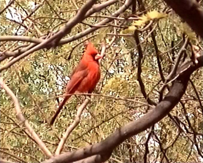 I already discussed the genus name Eupithecia (‘good-monkey’) in the report referenced above. The species name, phoeniceata, is a bit of a puzzle though. It would appear to go back via Latin to the Greek, meaning ‘Phoenician purple’. This is the colour, also known as Tyrian purple, that in Rome only emperors were allowed to wear. Its rarity and cost stemmed from the fact that it was made from sea snails of the genus Murex, and it took some 10,000 to 12,000 of the molluscs to produce 1 gram of the dye (using a laborious and smelly process). But the puzzle, of course, is why would this name be applied to a moth which is basically just black and (off-)white? I’ve read reports that say that the background colour of the moth can sometimes take on a reddish hue, but I’ve never noticed it either in photos or in real life. And in any case, why use the name of such a vivid colour if what you are describing is just a faint hue? I guess we’ll never know. Actually, this is not the only instance where this colour was used as the species name for something; Cardinalis phoeniceus is the name given to the Northern Cardinal, a common bird in the Eastern US; now that really is red, and fully deserving of the name! This is the only picture of my own I have of one, a still from an old video tape, but there are lots of pictures on the internet.