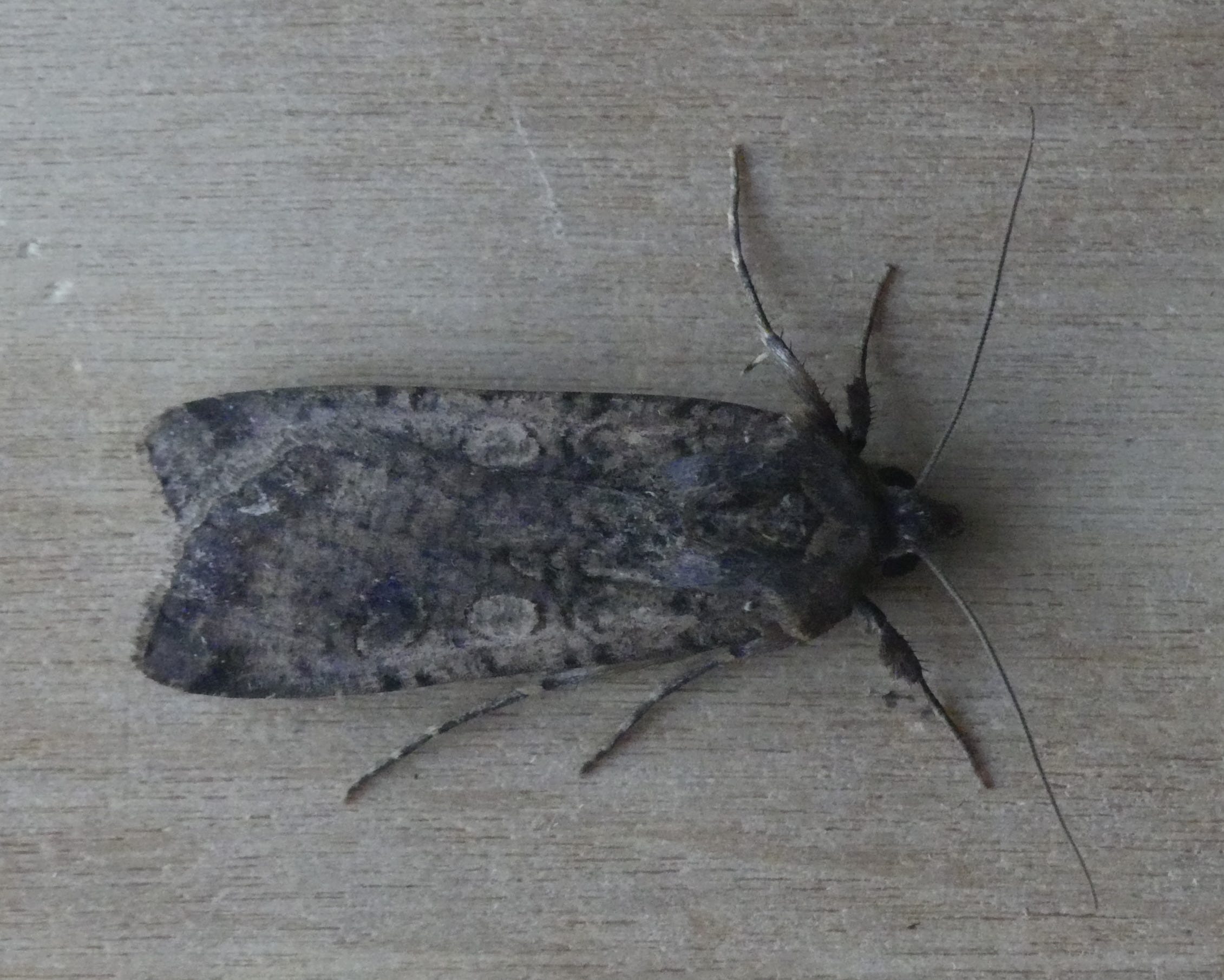 The genus name, Peridroma, has Greek roots; peri-, ‘about’ or ‘around’, and dromos, ‘course’, ‘race’ or ‘running’. This most likely relates to the moth’s migratory behaviour; ‘running around’ or similar, although another possibility is it could be associated with the moth’s tendency to scuttle away when disturbed (a bit like the Mouse Moth I wrote about previously). The species name, saucia, is Latin for ‘wounded’ or ‘injured’. This is more difficult to interpret, and the best I can come up with is that after a long flight it could well look rather tatty. However, even non-migratory moths can get very tatty when they’ve been around for a while, so if that’s the explanation then it’s a rather odd choice. In his book on moth names, Peter Marren suggests that it could be linked to a reddish tinge on the forewings, but my specimen certainly didn’t have such a tinge, and I don’t see any suggestion of it in the various photographs I’ve looked at. The colour of the forewing, though, is quite variable and some sources suggest it can stretch to ‘russet-coloured’. Another suggestion Peter Marren makes is that the behaviour of scuttling away when disturbed could make the moth look as though it is injured and unable to fly.