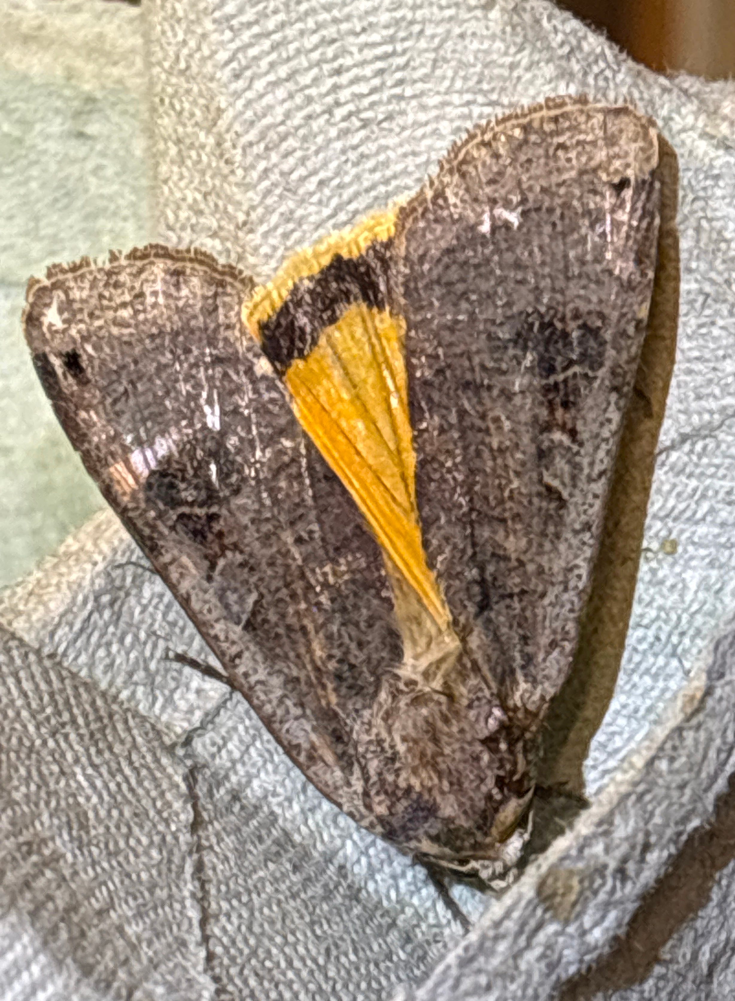 When the moth flies off there is always a flash of yellow; and flying off is something this species is very good at. Most of the larger moths require a certain amount of time to warm up their flight muscles before they take off - they sit vibrating their wings in order to do this. But not this one - a slight touch is often all that is needed and they can fly off without any warm up exercise first.