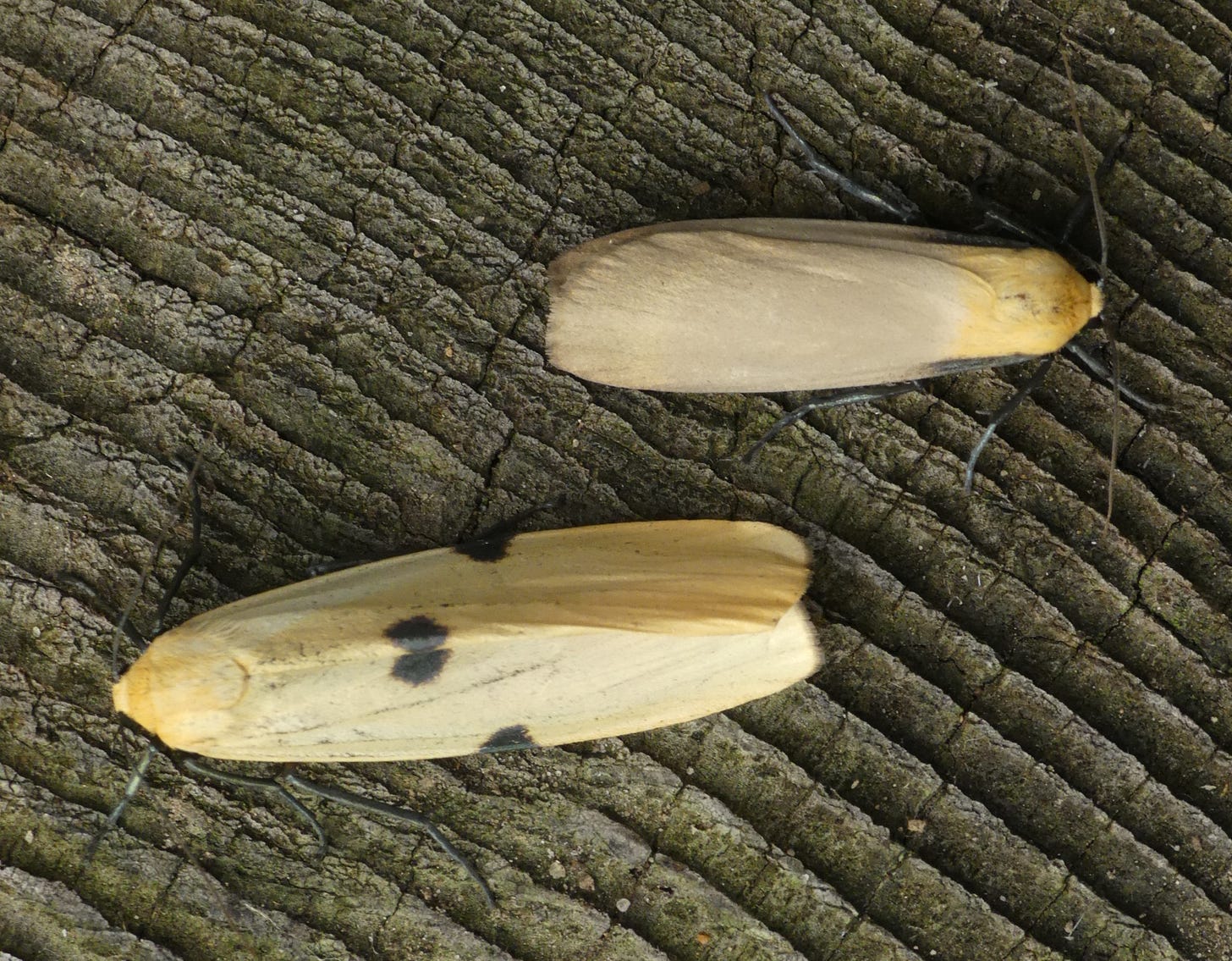 In the Four-spotted Footman the females are larger than the males, and are the only sex to bear the four dots which give the species both its English common name and its scientific species name. Often only three of these dots are visible when the moth is at rest, with the fourth being hidden under the folded wings. In my picture above, the fourth dot is just visible.