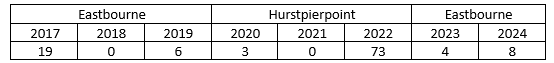 After 1872 this became a rare moth again, with short-lived colonies becoming established a few times right up until one night in August 2015, when 125 moths of this species were taken at a group of three light traps just along the coast from here (near Belle Tout lighthouse). Then the numbers were down again in 2016, but 2017 produced the highest numbers on record for Sussex (well over 400). But in 2019, fewer than 50 were reported for the whole county. These are my own counts from 2017 onwards: