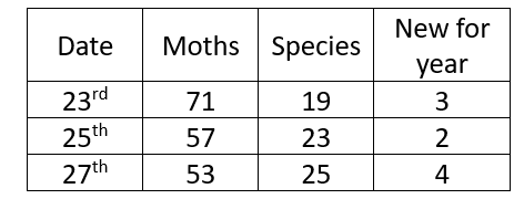 Relatively mild nights encouraged me to run the trap three times this week: Saturday night (27th) looked particularly promising because there was hardly any wind and the minimum forecast temperature was 14 degrees (Celsius), (compared with 11 for the other two nights). This is a summary of the results: