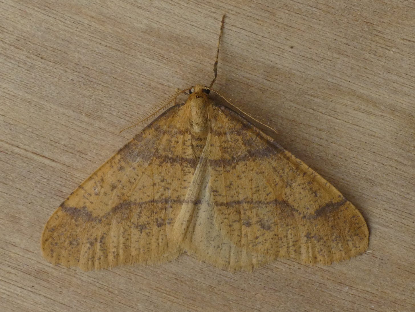 This moth (along with several others I’ve featured) is a member of the family Geometridae, which translates as ‘earth measurer’. The reason for this name is that the caterpillars have legs only at the back (two pairs) and front (three pairs) ends, whilst most other families have extra pairs of legs along the length of the body. The manner of locomotion of the Geometrid caterpillars is to pull the hind legs right up to the front legs, and then move the front legs forward as far as they can reach, and draw the hid legs up again, etc. This causes the body to alternate between stretched straight and bent into a loop, and gives the appearance that the caterpillar is measuring the ground as it moves forwards. It also gives rise to an alternative name for the family, the ‘loopers’. The German common name for this species is ‘Federfühler-Herbstspanner’ … the ‘spanner’ at the end of the name translates as ‘looper’ or ‘measurer’, and Herbst is autumn, so the second half of the moth’s name means ‘autumn looper’. The first part translates as ‘feather-feeler’, where the ‘feeler’ part refers to the antennae. When I was young I remember people using the word ‘feelers’ as a child-friendly version of ‘antennae’.