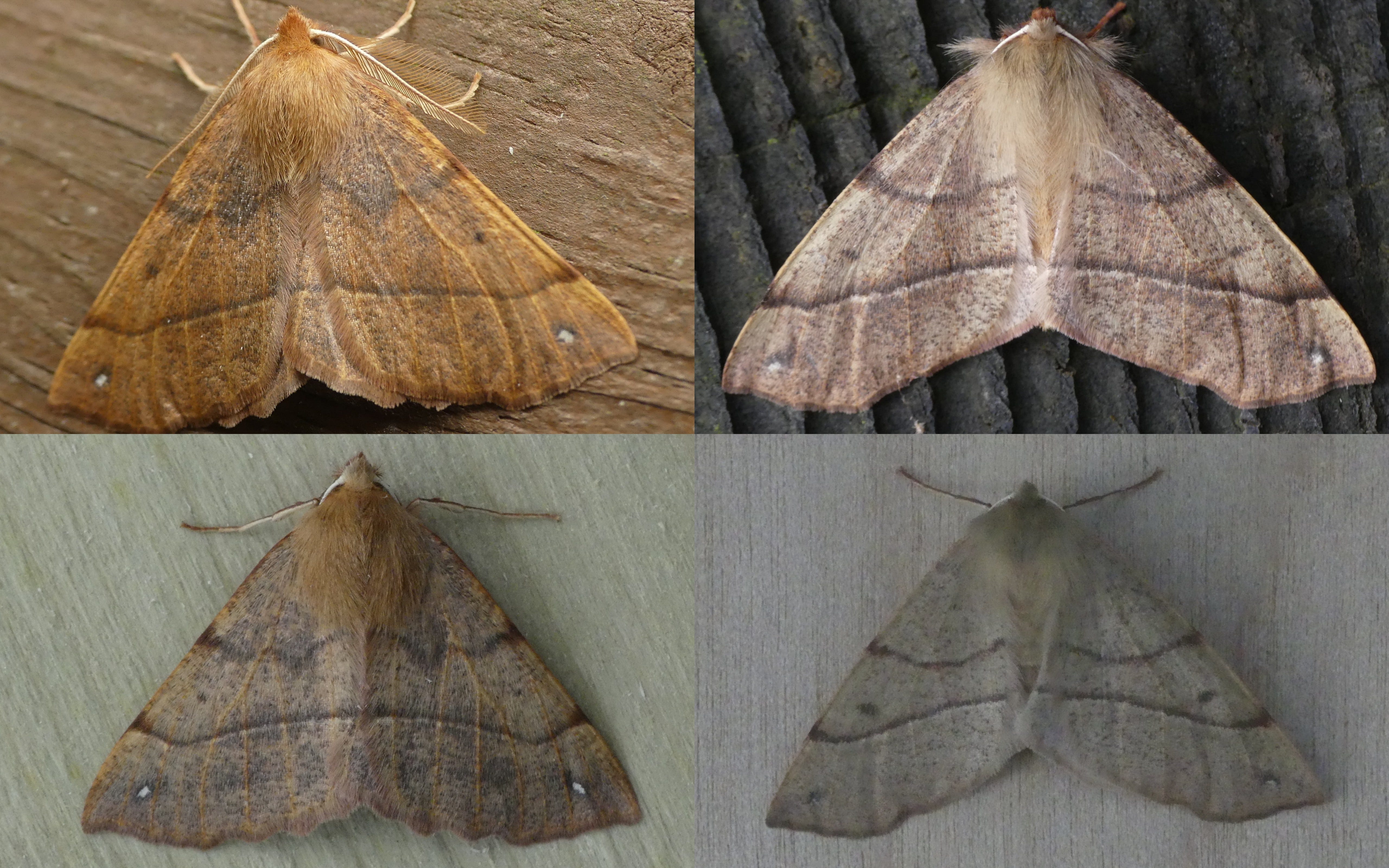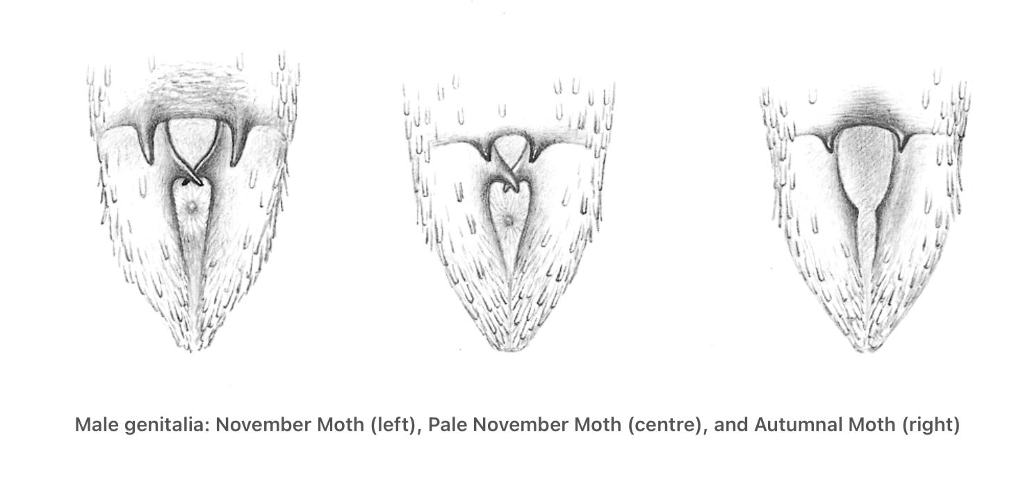 The females have a slightly different wing shape (being a bit broader at the base), and also the hindwings tend to protrude further beyond the forewings when the moth is at rest, so the picture at the bottom left is possibly a female, with the others more likely to be males. The females of the three species can’t be separated even by dissection, so if you really want to know which species a female is the only way is to let the female lay some eggs (which they do readily), breed the caterpillars through and wait for them to emerge the following November. If you’re lucky some of them will be males and then they can be identified to species.