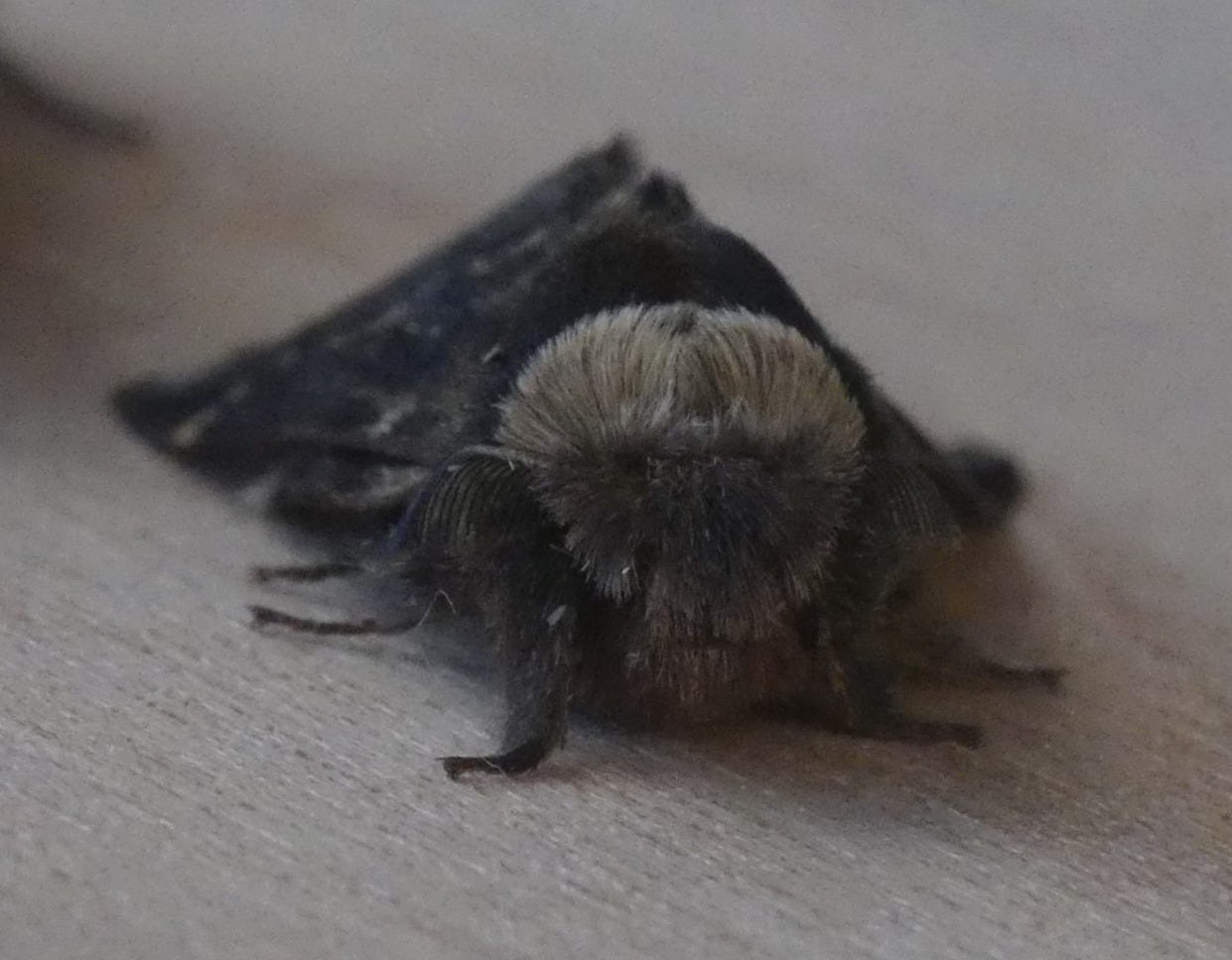 The general hairiness of the December Moth is one of its adaptations against the cold. It’s a strong flier and needs to have warm flight muscles; like many other species the moth can warm up its flight muscles by vibrating them, and the hairiness helps them retain the heat.
