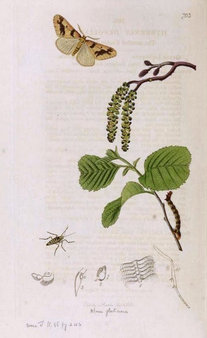 Although Clerk did include an illustration in his 1759 book, I’ve opted to show you instead an illustration made by John Curtis (1791-1862), from his book British Entomology (it actually has a much longer title1 ) which he published in 8 volumes between 1823 and 1840. This illustration is from Volume 6 (1834 or 1835), and shows both sexes, the caterpillar and one of its foodplants (it has many), as well as some detailed diagrams of various parts of its anatomy.