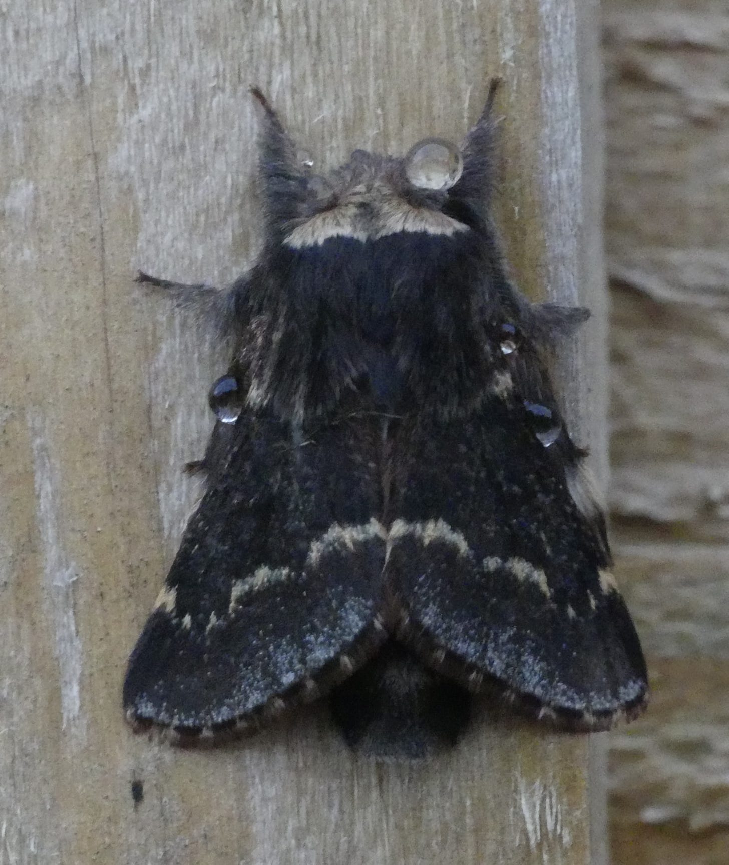 Several other winter-flying moths have flightless females (I already discussed the Scarce Umber (here), and the Mottled Umber is featured below), but the December moth has not evolved down this path. Instead both sexes have a number of adaptations which enable them to survive low temperatures. I once came across a photo of a December moth with several frost crystals on it. I haven’t been able to track down that photo, so you’ll have to make do with one with some raindrops (or maybe dew) on it: