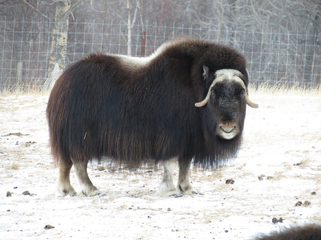 …. hulking, hairy and black. With its buff brow-band, seen front-on, the resemblance to a Musk Ox is uncanny.