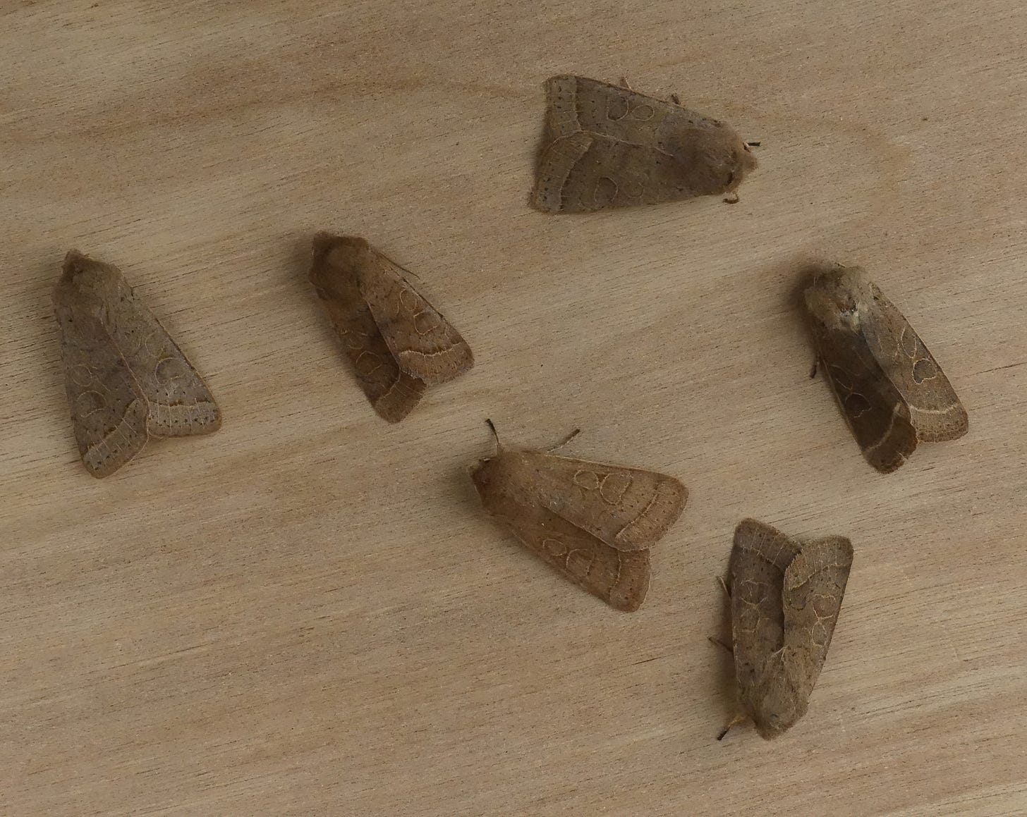 The one shown on the left here is fairly typical, while the one on the right has an unusually grey background colour. In addition to some variation in ground colour, sometimes specimens are found in which the stigmata (the two areas on the forewing surrounded by an approximately circular pale line) are touching, or even merged. This is the best example of that variation that I have a photo of: