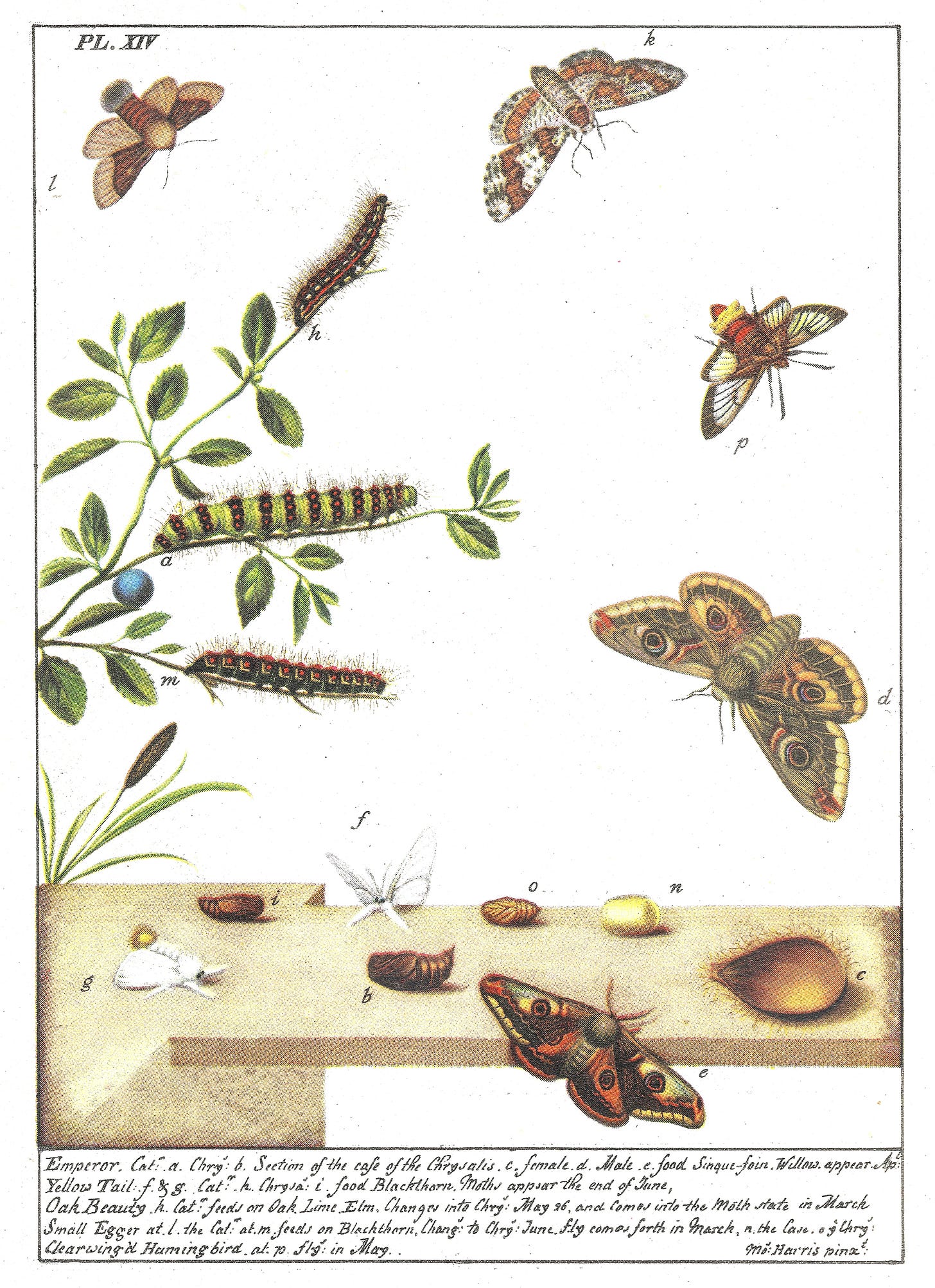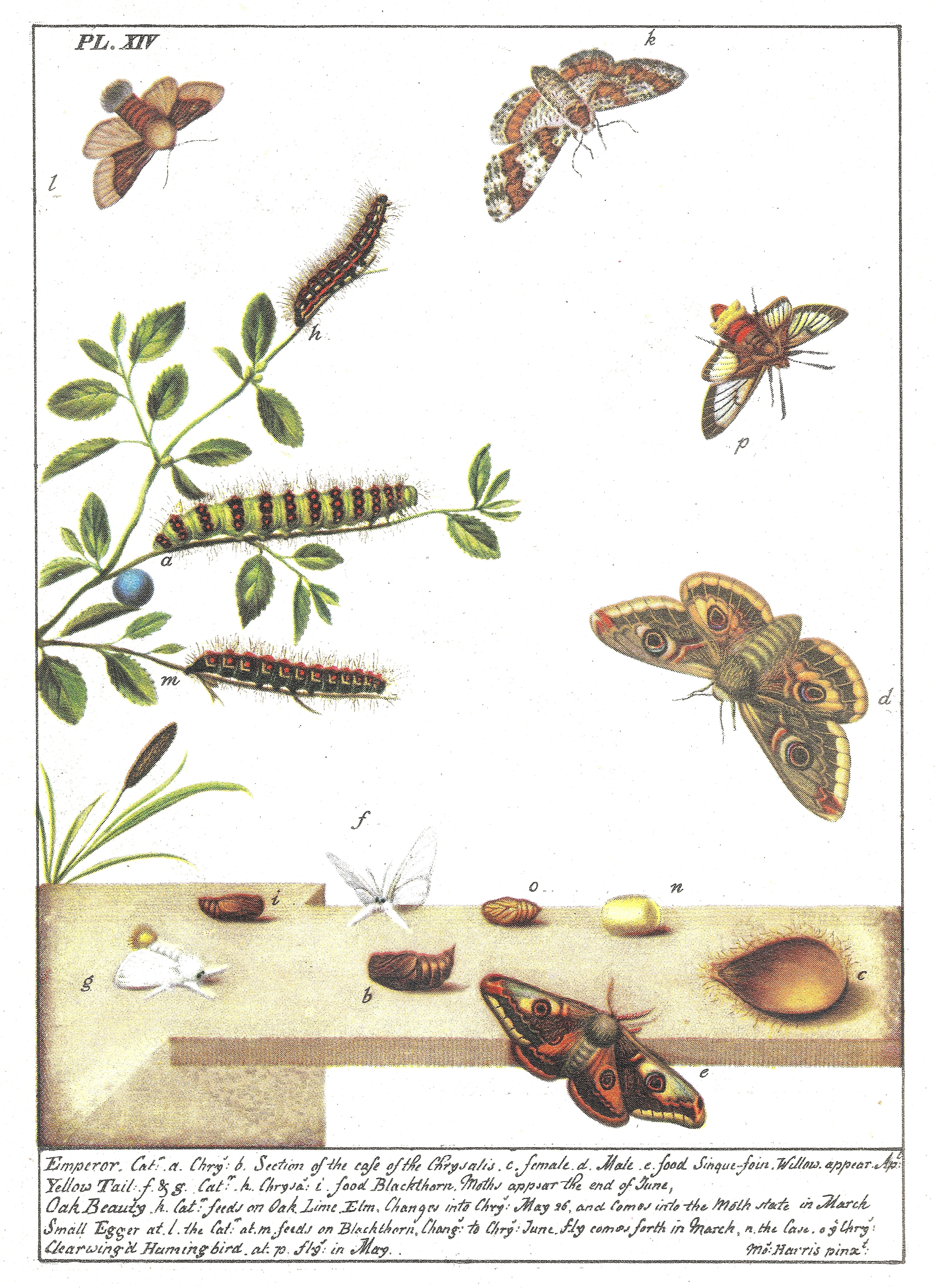 In a recent edition (here) I wrote about some of Moses Harris’s drawings from the 18th century being used in a book by Norman Riley, published in 1944. Here is plate 14 from that book which includes (among other moths) both the caterpillar (at h) and the adult (at k) of the Oak Beauty. According to a note in the text of Riley’s book, these illustrations of the Oak Beauty were not used by Harris in any edition of his book The Aurelian; this was therefore probably the first time that they were published.