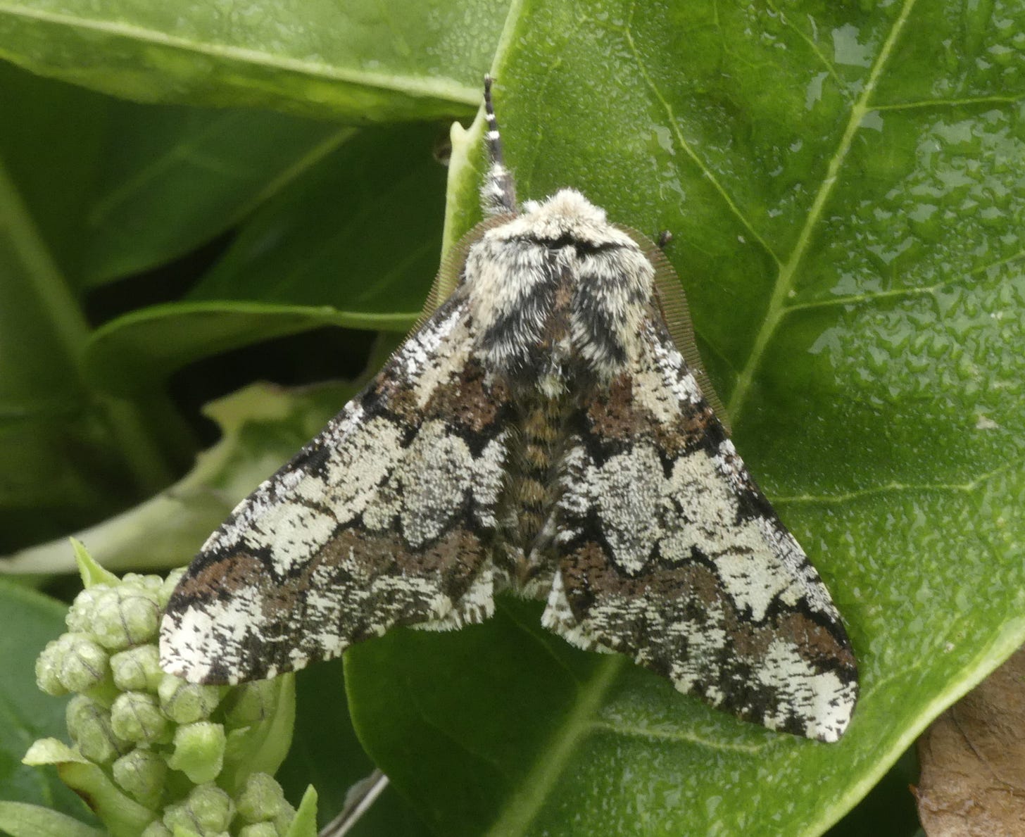 A couple of editions ago I wrote about the loose grouping of moths with ‘Beauty’ in their name; well this is one that is probably most deserving of the term. It’s the largest and most impressive of the moths that are around in early spring; I see them mostly in March but occasionally in February. It’s possible that I might hold a bit of a bias in its favour because I didn’t see my first until my third year of moth trapping (2019), in spite of having read about it and hoping to see one. Then I moved to Hurstpierpoint where I saw another the following year, and in my third year there I saw 12. Then back in Eastbourne again the next year (2023) I saw only two, but last year the total was 13. This is a moth that is said to prefer mature oak woodland, although Chris Manly in Moths of Britain and Ireland says it also occurs in suburban areas. While my records indicate numbers to be increasing at the moment (to get 4 on the same night, as I did on 5th March, equals a record set on 19th March last year), the Atlas of Britain and Ireland’s Larger Moths reports a decline in numbers since the 1970s.