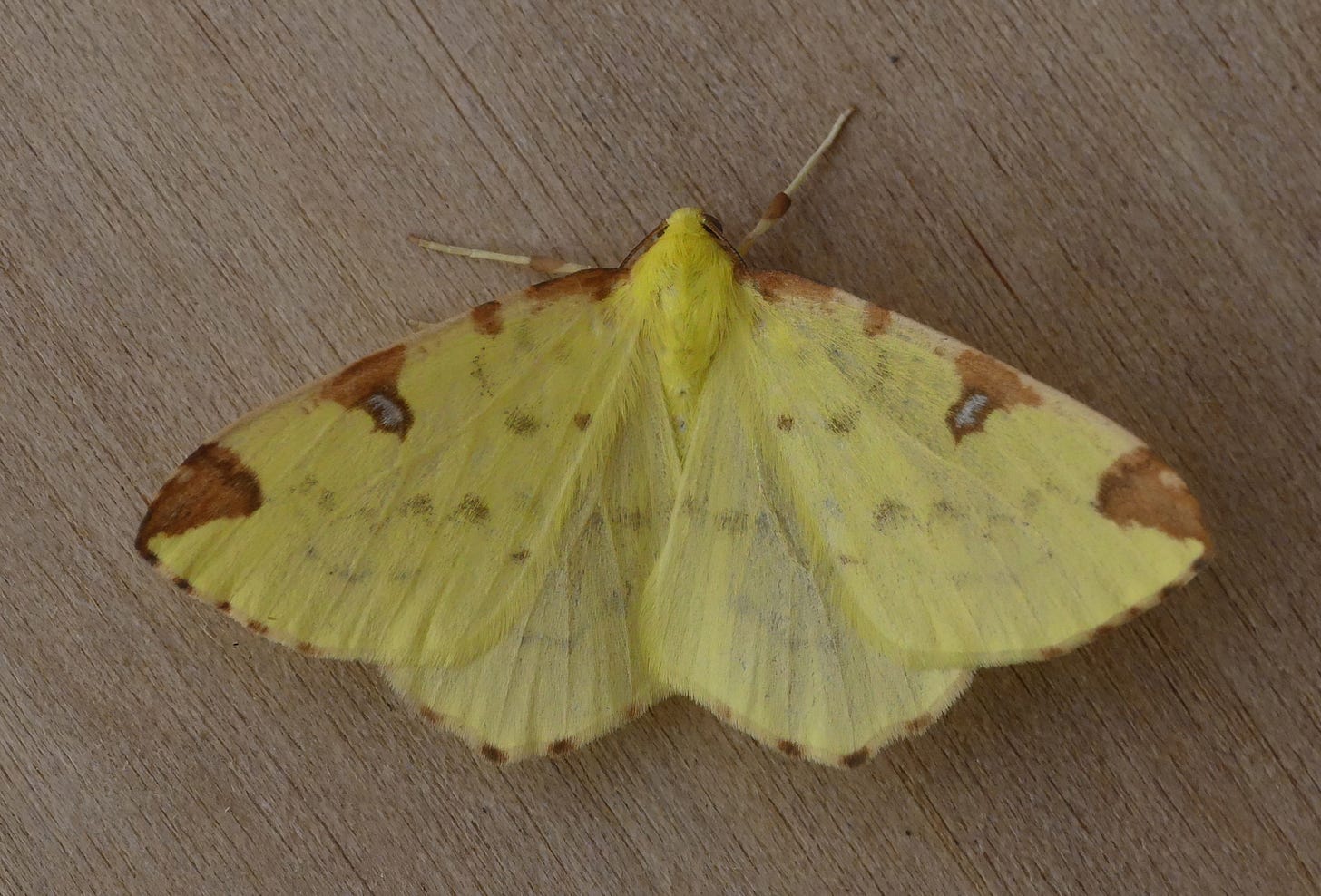 Not to be confused with the Brimstone butterfly, the Brimstone moth is nonetheless the same lemony yellow colour, but rather smaller and with brown markings on the wings. Both are named after the element sulphur, for which brimstone is an old name, often found deposited around volcanic vents (hence the biblical ‘fire and brimstone’). The specific name, luteolata, is derived from the Latin luteus (meaning yellow), which is in turn related to lutum, the name of a plant which was used to produce a yellow dye. Very occasionally, specimens can be found in which the yellow ground colour is replaced with cream or even white, although I’ve never seen one like that.