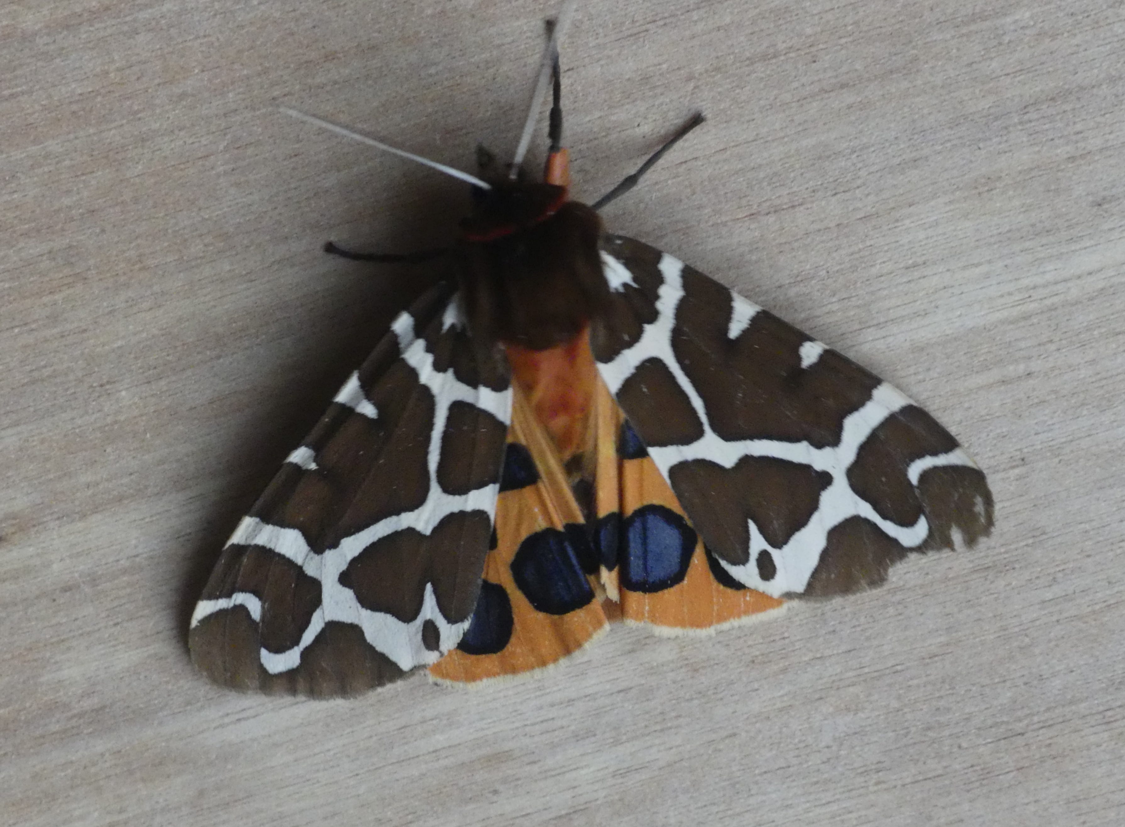 There are several moths in the UK which are grouped together by the common name ‘Tiger’. But why this is so in not so clear; only one (the Jersey Tiger) has a striped pattern. In other European countries the common names tend to reference flags or bears. The generic name Arctia is derived from the ancient Greek for bear (arktos), but whether this is why we call the caterpillars ‘woolly bears’ is again not clear. The specific name, caja (conferred by Linnaeus), is a bit of a conundrum. One possibility is that, in common with some of the other moths in this group, he wanted to give it a name with Roman connections. I’ve read that caja is the female form of the Roman name Caius (or Gaius), but if that was Linnaeus’s intention then he slipped up, because the usual female form for this name would be Caia (or Gaia), not Caja.