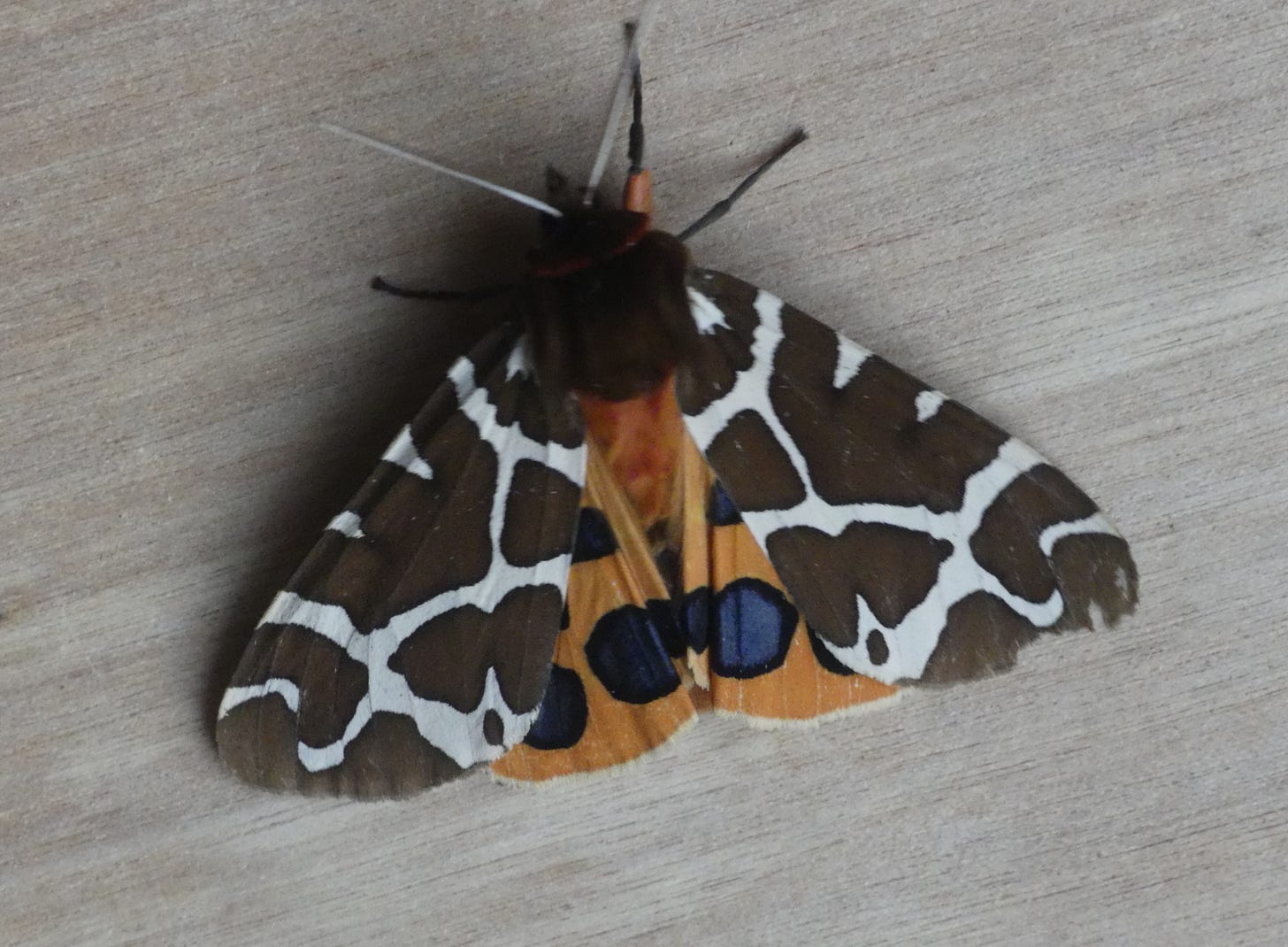 I’m sorry the photo of today’s moth is a bit blurred, but it’s the only one I managed to get which shows the brightly coloured hindwings, which serve as a warning to potential predators that the moth is toxic. When the moth is sitting at rest, the hindwings are hidden; when the moth is disturbed it flashes its hindwings, but it also tries to crawl or fly off (which is why my photo is blurred!). Resting photos are much easier:
