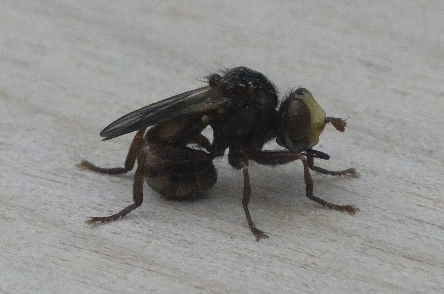 This is a rather weird-looking fly! It’s a parasite of bumblebees. The name ‘bee-grabber’ describes the way the female lays its eggs on a bee - she grabs hold of a bee that’s flying or nectaring, curls her abdomen underneath the bee, pierces the bee’s abdomen with her ovipositor, and lays an egg inside the bee. When the egg has hatched the larva feeds on the bee from the inside, until it’s ready to pupate. Parasites that use this rather gruesome form of parasitism are called endoparasites. It’s remarkably common among insects; apologies for ending this post on such an unsavoury note!